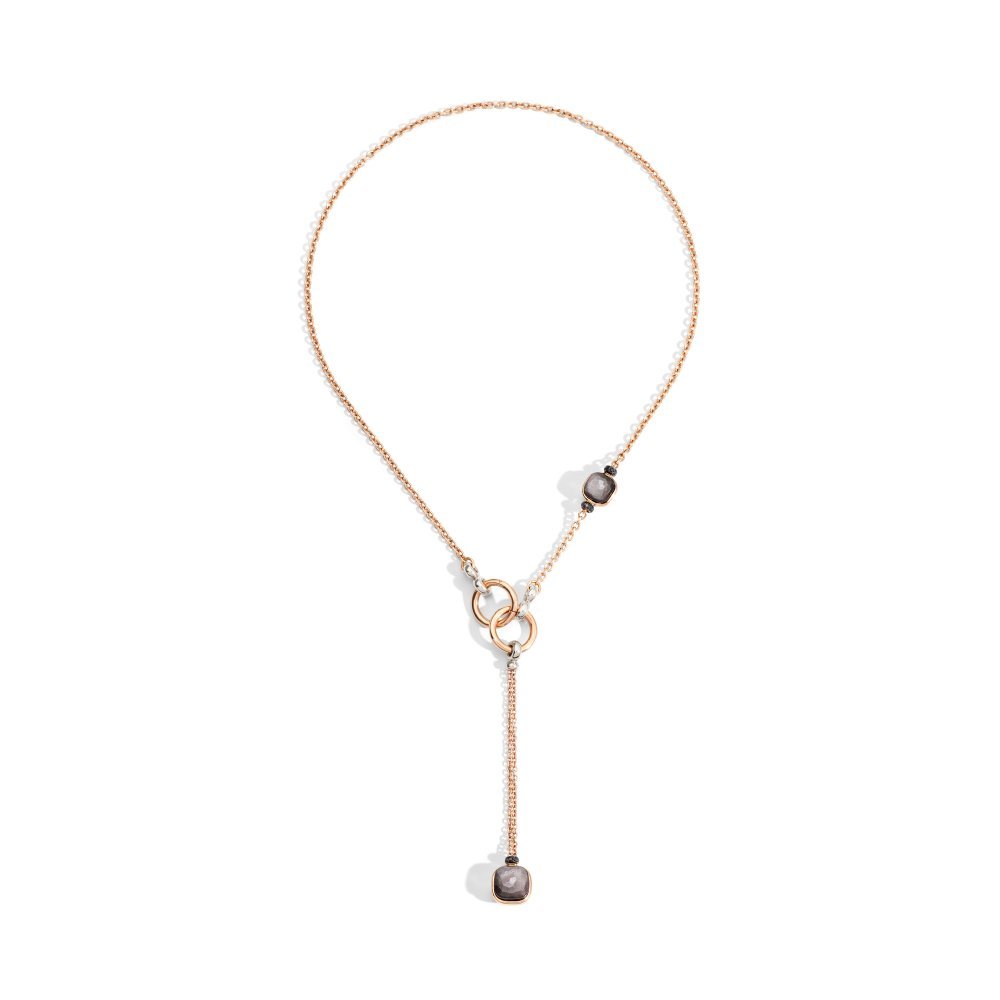 Collana Oro Rosa e Bianco, Ossidiane e Diamanti black trattati. Collana con pendente. Nudo splende anche in una collana che si indossa in tre modi: come sautoir classico, come lariat con pendente o come collana a due giri. Le pietre Nudo mostrano il taglio “Clessidra” a due facce, che espone la gemma in tutta la sua essenziale preziosità. Lunghezza cm 53.