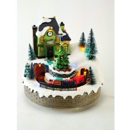 Carillon natalizio con treno e albero rotanti, melodie e luci.