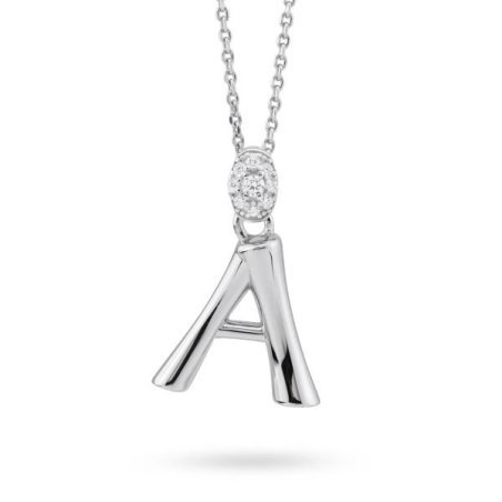 Collana in argento, modello girocollo, con lettera A pendente e contromaglia di zirconi.
