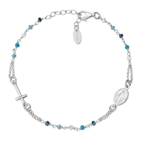 Il Bracciale Rosario di Amen è realizzato in argento 925 con una finitura rodiata che garantisce una lucentezza duratura. I grani di cristalli sfaccettati multicolor nei toni del blu, azzurro e celeste aggiungono un tocco di colore e eleganza. Il bracciale è arricchito da una croce e una medaglietta raffigurante la Madonna Miracolosa, simboli di fede e protezione. La lunghezza è regolabile da 18 a 20 cm grazie alla chiusura a moschettone e alla catenina di allungo, offrendo una vestibilità comoda e sicura.