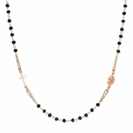 Rosario girocollo in argento rosé con cristalli neri e dettagli religiosi.