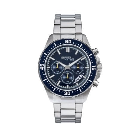 Il cronografo Trial di Breil Tribe si distingue per la sua cassa da 44 mm in acciaio satinato, abbinata a una lunetta in acciaio con disco in alluminio navy blue arricchito da dettagli gialli che ne esaltano il carattere sportivo. Il quadrante navy blue con finitura mat conferisce un look grintoso, mentre indici e sfere con trattamento luminous garantiscono massima leggibilità anche in condizioni di scarsa luminosità. Il datario è posizionato tra le ore 4 e 5, per un design funzionale e preciso.