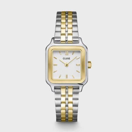L'orologio Gracieuse Petite da donna di Cluse è un elegante accessorio con una cassa quadrata da 24 mm in acciaio color oro e argento. Il quadrante bianco si abbina perfettamente al cinturino in acciaio inox a tre maglie color oro e argento da 14 mm. La dimensione del cinturino è facilmente regolabile, permettendo una personalizzazione semplice e autonoma. Scopri le altre misure disponibili per questo orologio e aggiungi un tocco di classe al tuo look quotidiano.