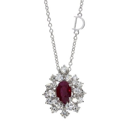 Collierino in oro bianco con diamante e rubino, taglio ovale, caratura 0.87.