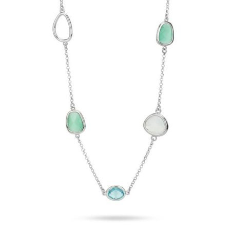 Collana rodiata con cristalli verde chiaro, bianco e acquamarina, tra moduli a goccia.