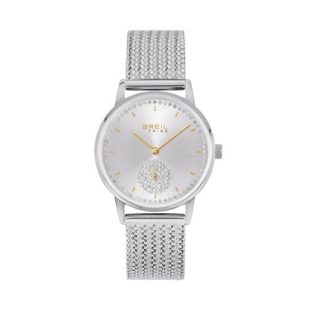 L'orologio da donna Drop di Breil Tribe, realizzato in acciaio lucido, si distingue per il suo movimento dei secondi e il quadrante silver con effetto sunray che cattura la luce creando riflessi eleganti. Il rehault è impreziosito da cristalli, mentre il contatore a ore 6 è decorato con pavè di cristalli bianchi. Gli indici silver, le sfere gold e il bracciale in maglia mesh completano con eleganza questo segnatempo, avvolgendo il polso in modo sofisticato.