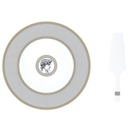 Piatto torta in porcellana Palladium con paletta coordinata e decoro dorato.
