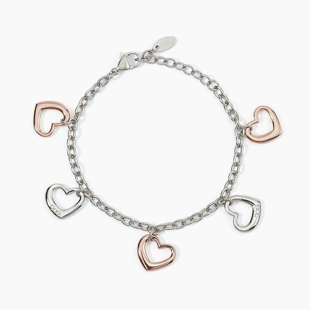 Bracciale in acciaio 316L con ciondoli cuore e cristalli, lunghezza regolabile.
