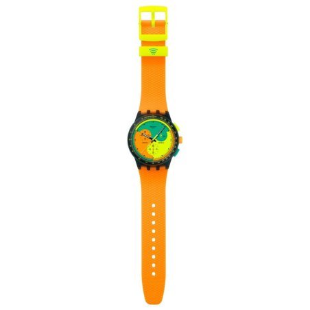 Il Swatch Neon Signal Flag Pay! è un cronografo ispirato a un modello anni '90, il SIGNAL FLAG da collezione. Presenta un quadrante multicolore con lancette nere che si illuminano al buio e una lancetta dei secondi del cronografo gialla. La cassa nera opaca trasparente è completata da una lunetta coordinata con scala tachimetrica gialla. Il cinturino arancione opaco con passante giallo e stampa verde aggiunge un tocco di stile. Con un diametro di 42 mm e uno spessore di 14.03 mm, questo orologio al quarzo è impermeabile fino a 3 Bar.
