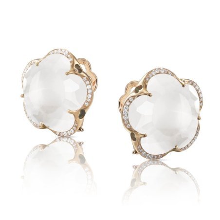 Gli Orecchini Bon Ton di Pasquale Bruni sono realizzati in oro rosa 18k con quarzo latteo e diamanti. Il design a fiore a cinque petali rappresenta l'icona della Maison, evocando uno stile di vita elegante e sofisticato. La collezione Bon Ton si è adattata ai tempi e alla società in evoluzione, mantenendo la semplicità e la grazia innata del suo emblema. Il taglio brevettato 'Bon Ton' delle pietre presenta petali sfaccettati culminanti in un pistillo cabochon al cuore del gioiello. Il quarzo latteo, noto come 'Ghiaccio dell'Eternità', possiede un'energia femminile e ricettiva, ed è una delle pietre più potenti.
