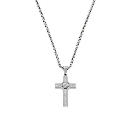 Collana da uomo in acciaio con croce e zirconi bianchi, lunghezza regolabile.