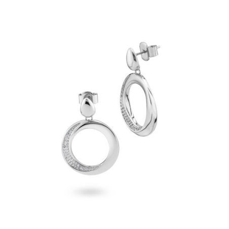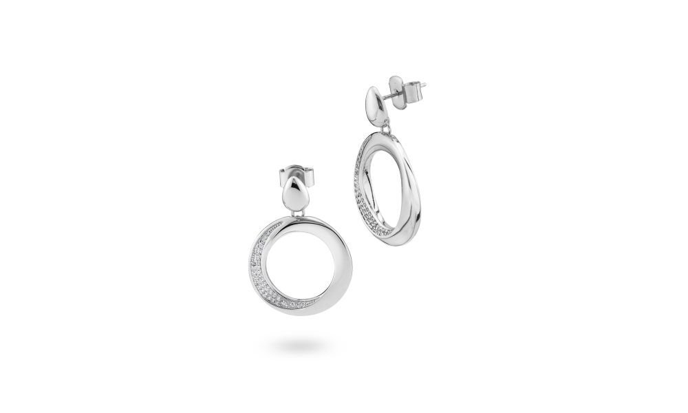 Orecchini rodiati con modulo circolare pendente e pavè di zirconi.