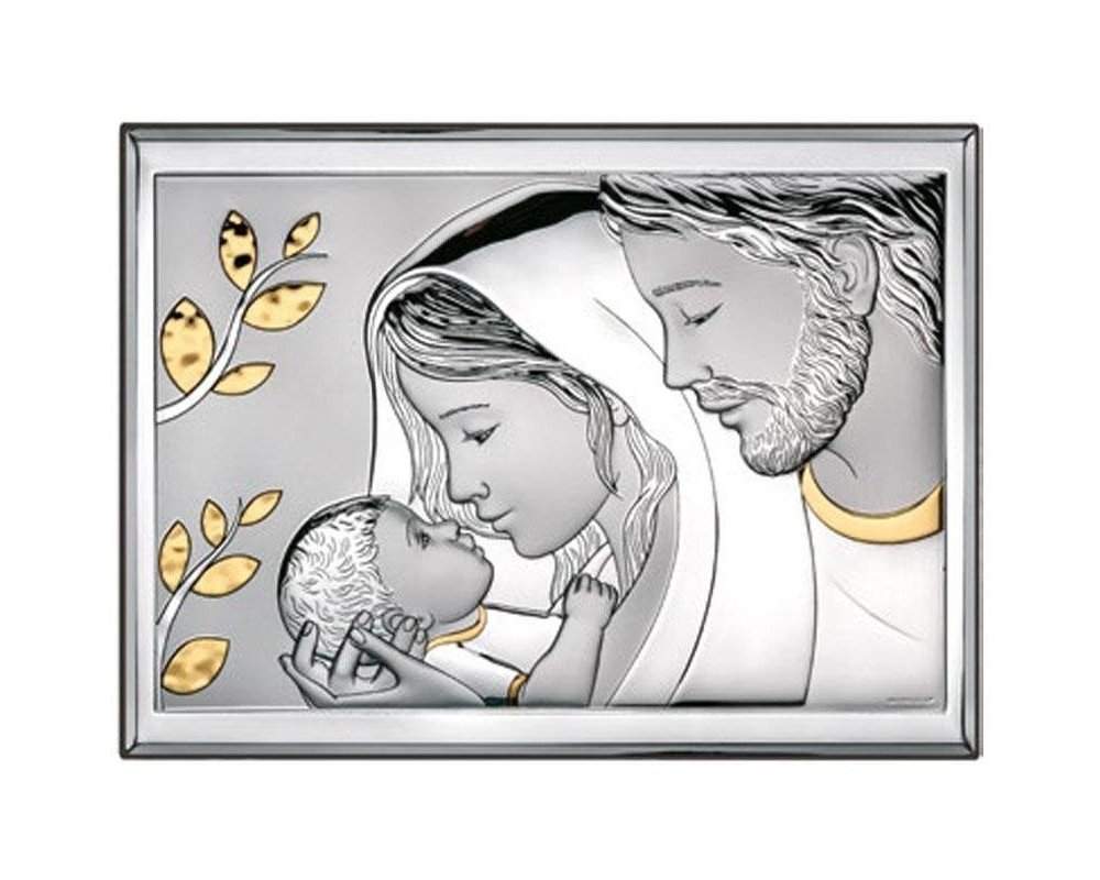 Icona Sacra Famiglia in argento laminato con dettagli dorati e retro in legno.
