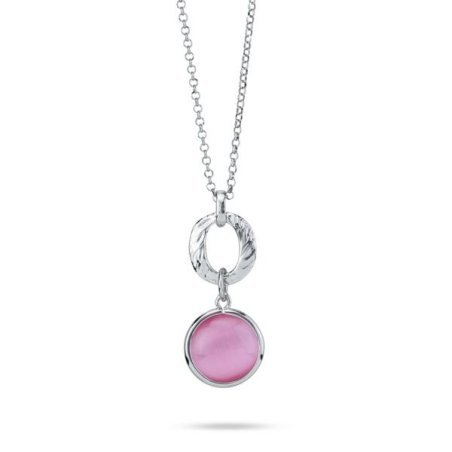 Collana rodiata con pendente composto da un modulo circolare martellato e da un cristallo effetto cabochon di colore rosa chiaro.