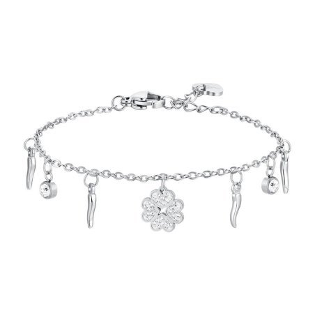 Bracciale in acciaio con quadrifoglio e corni, simbolo di eleganza e fortuna.