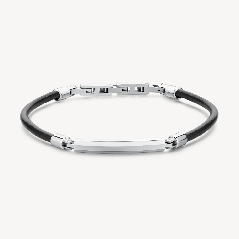 Bracciale in pelle nera con piastrina in acciaio, collezione ORIGIN.