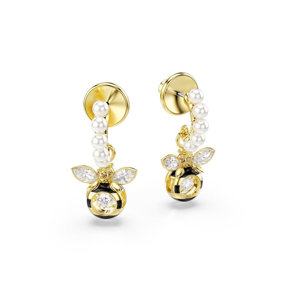 I deliziosi orecchini Idyllia combinano due api operaie che vibrano di pura luce. Ogni ape placcata in tonalità oro è incastonata su un mini cerchio con micro Crystal Pearls Swarovski, mentre al centro si annida una pietra danzante trasparente per riflessi infiniti. Abbinali al girocollo, all’anello o al bangle con l’ape per creare un alveare di gioielli ispirati alla natura.