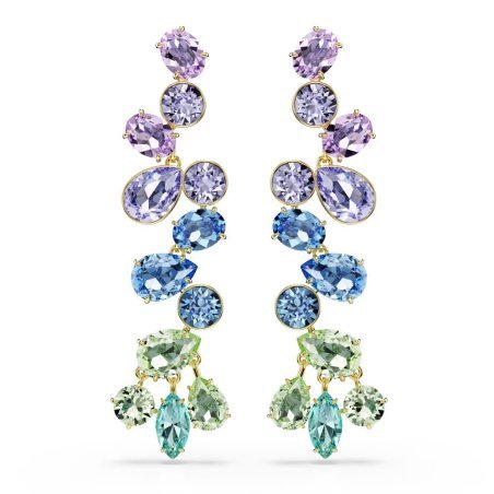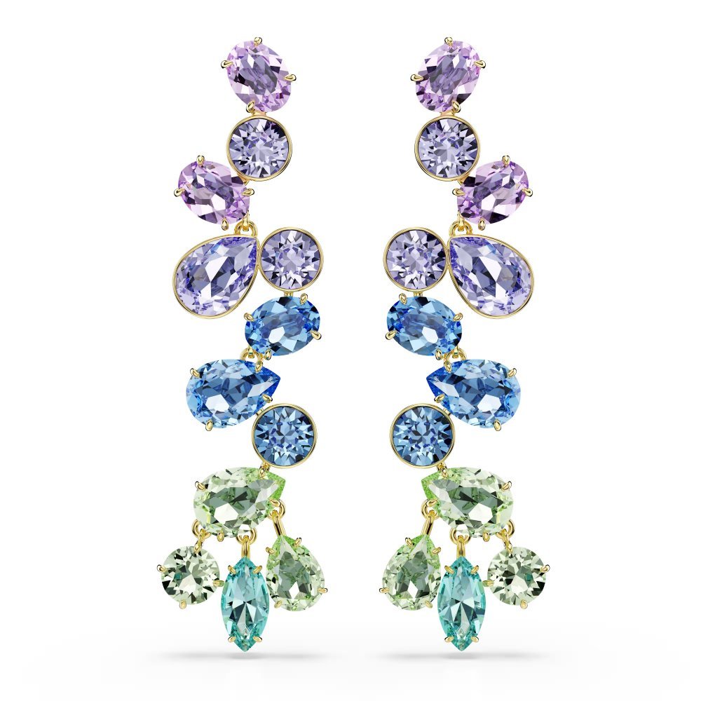 Ogni guardaroba di lusso ha bisogno di un paio di intensi orecchini chandelier. Lo straordinario stile a cascata è composto da cristalli Cry in varie tonalità di viola, verde e blu, tutti incastonati in una montatura placcata in tonalità oro. Le articolazioni mantengono inoltre i cristalli in movimento, assicurando un costante gioco di luce vivace.