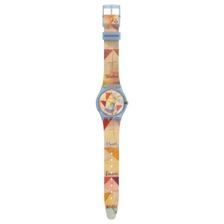 L'orologio Klee'S Bavarian Don Giovanni della collezione Swatch x Guggenheim è un omaggio all'arte di Paul Klee. Presenta una cassa biosourced azzurra trasparente e opaca con vetro biosourced, mentre il quadrante e il cinturino trasparente opaco mostrano una stampa dell'opera d'arte 'The Bavarian Don Giovanni'. Le lancette delle ore, dei minuti e dei secondi sono di colore giallo, e la finestra a ore 12 cambia colore ogni giorno grazie al disco del datario multicolore. Il passante trasparente azzurro opaco è decorato con il logo del Guggenheim, completato da una fibbia trasparente azzurra opaca. Un pezzo unico che unisce arte e funzionalità.
