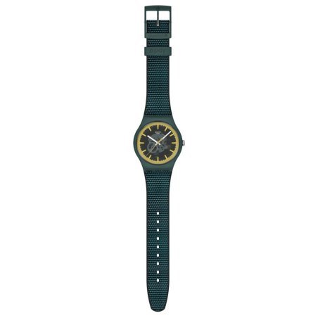 Il Swatch Perfectly Green Pay è un orologio innovativo che combina design e funzionalità. Presenta un quadrante verde scuro trasparente con indici delle ore gialli e tacche dei minuti bianche. Le lancette bianche si illuminano al buio, mentre la lancetta dei secondi è gialla. La cassa opaca verde scuro è realizzata in materiale di origine biologica, così come il vetro. Il cinturino nero opaco con inserto in tessuto verde scuro è completato da un passante e una fibbia verde scuro opaco. Questo orologio è impermeabile fino a 3 Bar e funziona con un movimento al quarzo, rendendolo perfetto per l'uso quotidiano.