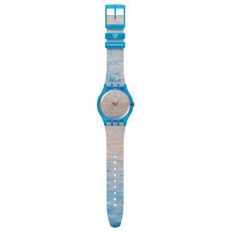 Orologio Swatch Pay con stampa di Monet, cassa e cinturino blu.