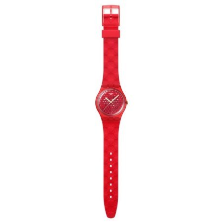 Lo Swatch Love In Scarlet è un orologio speciale per San Valentino, caratterizzato da un quadrante rosso con intagli a forma di cuore che rivelano il meccanismo interno. Le lancette delle ore e dei minuti sono color oro e si illuminano al buio, mentre la lancetta dei secondi è bianca. Il tutto è protetto da un vetro biosourced in una cassa trasparente e opaca rossa di origine biologica. Il cinturino rosso opaco presenta un motivo a cuore in rilievo, completato da un passante rosso opaco e una fibbia trasparente e opaca rossa.