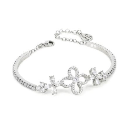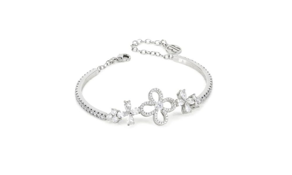 Bracciale in bronzo rodiato con motivo floreale centrale di zirconi color crystal sorretto da due fiori e fascia impreziosita da zirconi.