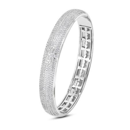 Bracciale in bronzo rodiato con fascia in pavè di zirconi e fiore incastonato al centro. Dotato di galleria interna con il caratteristico motivo floreale 'Nexma'.