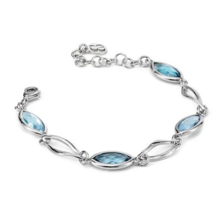 Bracciale in bronzo rodiato con cristalli acquamarina e moduli ovoidali, regolabile e con medaglietta logo.
