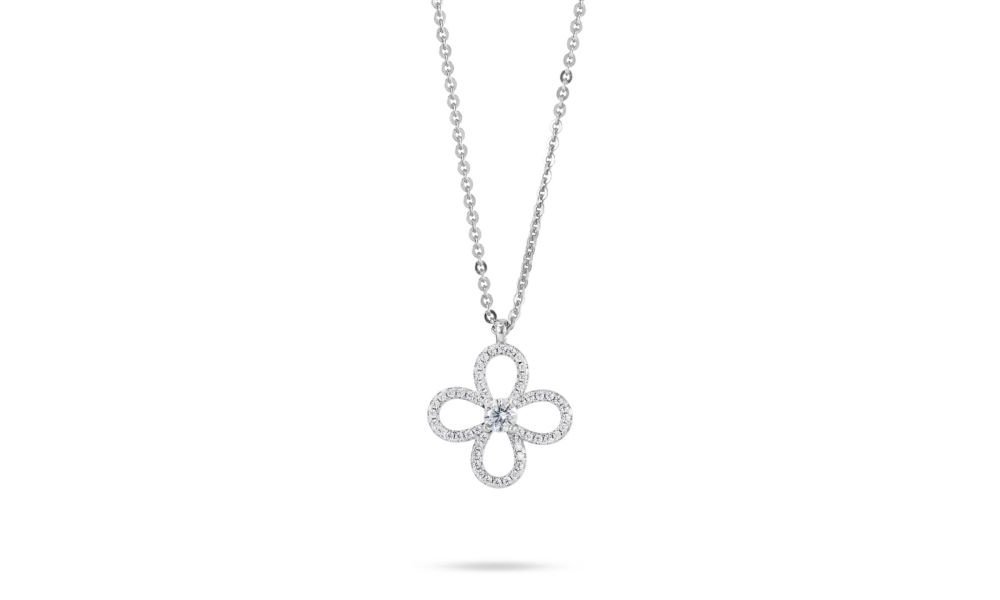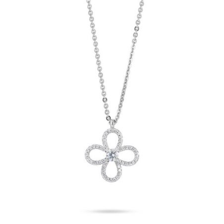 Girocollo in bronzo rodiato con quadrifoglio pendente impreziosito da zirconi.