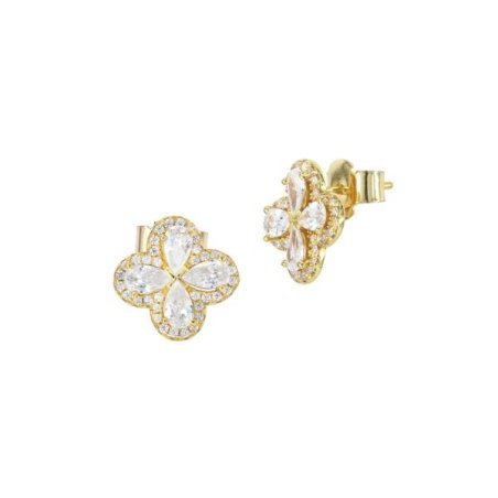 Orecchini a lobo in bronzo placcato oro giallo con quadrifoglio in pavè di zirconi e fiore centrale di colore crystal.