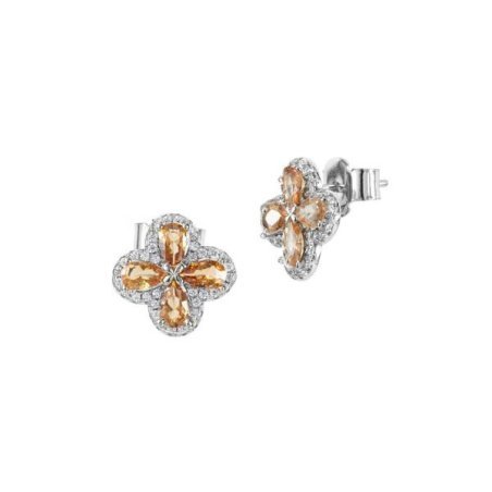Orecchini a lobo in bronzo rodiato con quadrifoglio in pavè di zirconi e fiore centrale di colore peach.