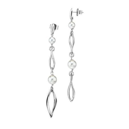 Orecchini pendenti in bronzo rodiato con perle e moduli elicoidali, ideali per cerimonie.