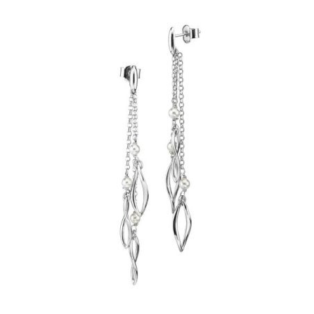 Orecchini pendenti in bronzo rodiato con perle e moduli elicoidali, ideali per cerimonie e occasioni speciali.