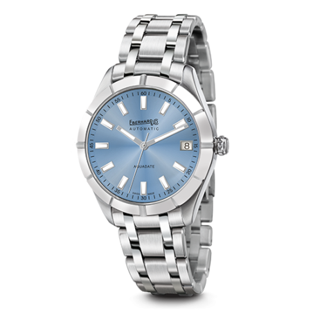 L'orologio Aquadate Grande Taille di Eberhard presenta un design elegante con un quadrante azzurro chiaro e finitura 'soleil'. Gli indici applicati con luminescenza e le mani di tipo 'bâton' aggiungono un tocco sofisticato. La cassa in acciaio è dotata di una corona a vite personalizzata e un fondello fissato da 8 viti. Il bracciale in acciaio Charme completa l'aspetto raffinato di questo orologio meccanico automatico, resistente all'acqua fino a 100 metri.