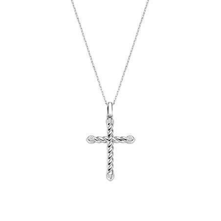 Collana in ottone con croce intrecciata e zirconi bianchi, lunghezza regolabile.