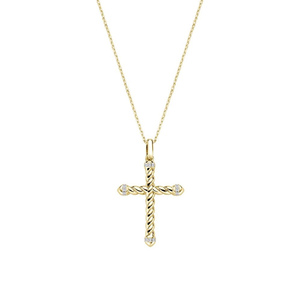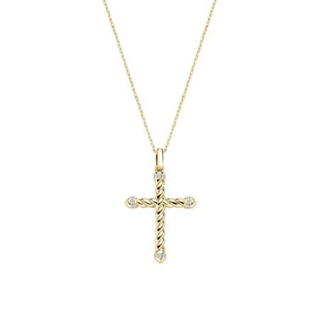 Collana in ottone dorato con croce intrecciata e zirconi bianchi, lunghezza regolabile.
