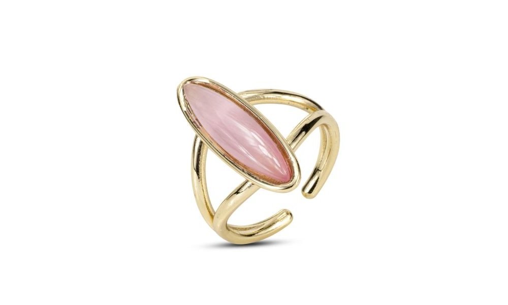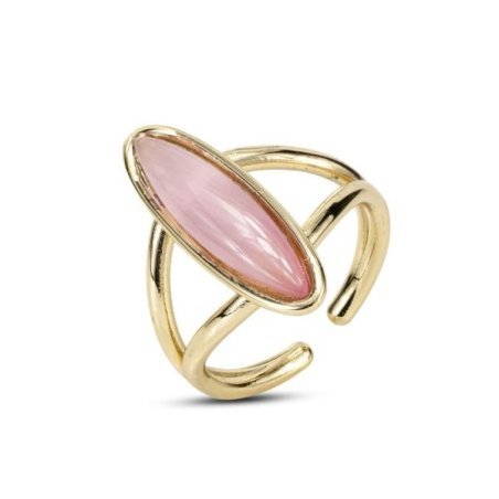 Anello in bronzo placcato oro giallo con cristallo rosa ovale, versatile e ideale per occasioni speciali.