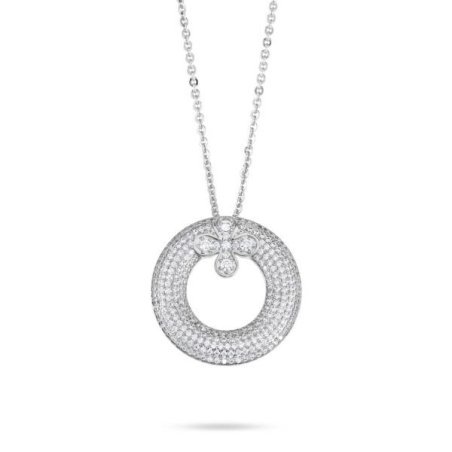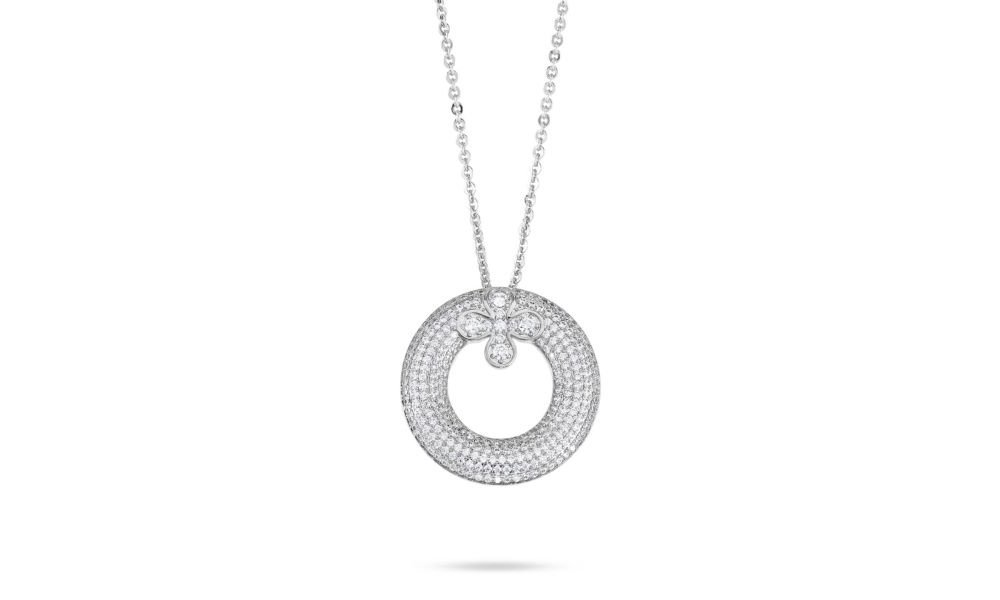 Girocollo in bronzo rodiato con pendente a forma circolare in pavè di zirconi e fiore incastonato al centro.