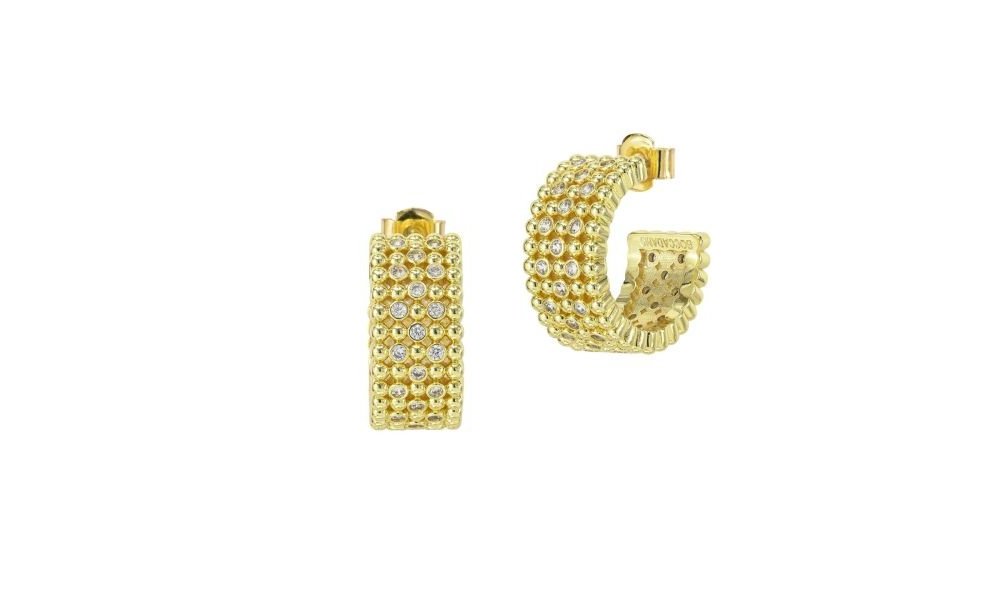 Orecchini a semicerchio in bronzo placcato oro giallo con fascia in texture sferica e zirconi incastonati.