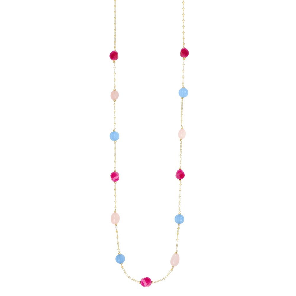 Questa collana in argento 925 dorato si distingue per un design leggero e arioso, caratterizzato da una sottile catena a maglia intervallata da pietre naturali dai colori delicati. La composizione alterna armoniosamente la dolcezza del quarzo rosa alla vivacità della giada cocomero blu, completata da una selezione di pietre dure che aggiungono varietà cromatica e materica al gioiello. Le pietre, dai tagli organici e sfaccettati, sono distribuite lungo tutta la lunghezza di 74 cm, creando un accessorio versatile e raffinato. La struttura in argento dorato scalda le tonalità fredde delle gemme, rendendo questa collana ideale per illuminare il décolleté con un tocco di eleganza discreta e colorata, perfetta da indossare ogni giorno.