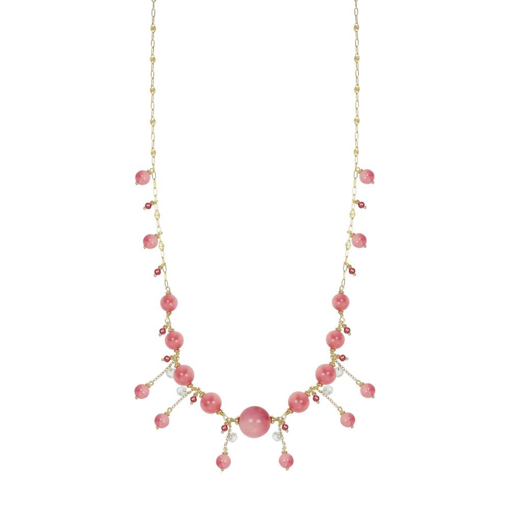 Collana in argento dorato con quarzo fragola e zirconi, elegante e regolabile.