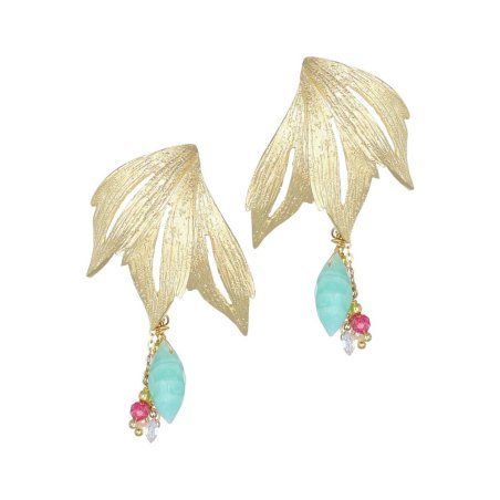 Gli orecchini Saphira di Nivy sono un capolavoro di design scenografico, realizzati in argento 925 con una luminosa placcatura in oro giallo. La parte superiore presenta un elemento scultoreo a forma di foglia stilizzata, impreziosito da una lavorazione granulosa che conferisce un effetto brillantini vibrante. Questa finitura artigianale permette alla superficie dorata di riflettere la luce con intensità, incorniciando il volto con bagliori continui. Dalla struttura principale pende un raffinato grappolo di gemme, tra cui l'amazzonite verde acqua, piccoli zirconi fucsia e rosa, e delicate perle d'acqua dolce, creando accenti cromatici vivaci e una lucentezza perlata elegante. Perfetti per completare una parure di alta gamma, questi orecchini sono ideali per occasioni speciali grazie al loro sistema di chiusura a perno con farfallina che garantisce una vestibilità sicura e confortevole.