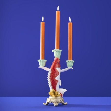Candelabro Pesce Koi di Werner Vos in poliresina, colori rosso-bianco-verde.
