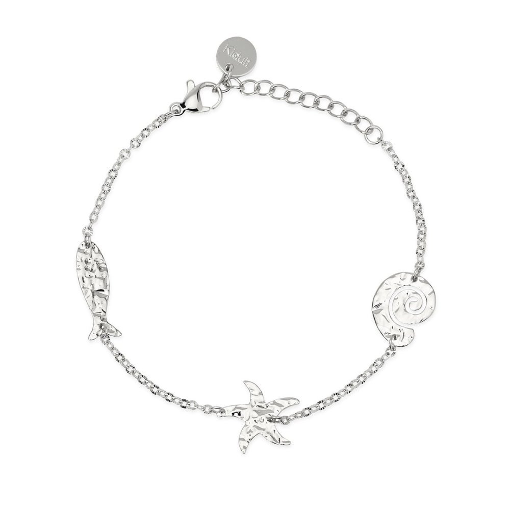 Il bracciale in acciaio 316L di Kidult è un accessorio elegante e versatile, perfetto per ogni occasione. Con una lunghezza regolabile da 16 a 19 cm, questo bracciale presenta una catena con elementi martellati a forma di pesce, stella e conchiglia. Le dimensioni della catena sono di 1.8 mm di larghezza, mentre il pesce misura 6x18 mm, la stella 12.9x14 mm e la conchiglia 10.6x13 mm. Un gioiello raffinato che aggiunge un tocco di stile al tuo look quotidiano.