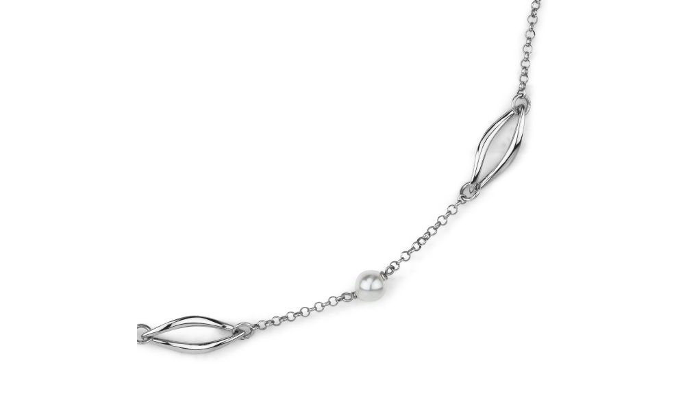 Collana girocollo in bronzo rodiato con perle e moduli ovoidali, ideale per cerimonie.