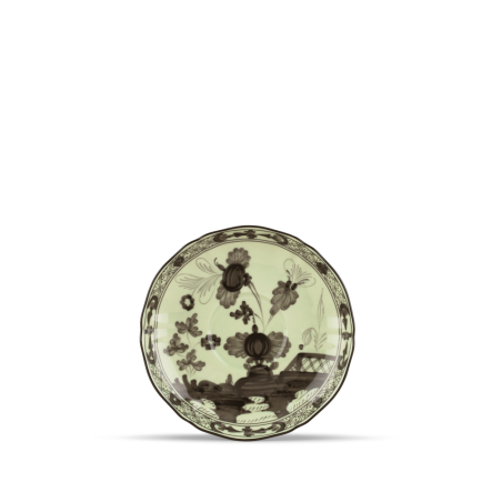 Il piatto da tè della collezione Oriente Italiano di Richard Ginori presenta la forma Antico Doccia con il celebre motivo 'a garofano' che risalta sulla porcellana decorata di verde bario. Questo piatto completa il servizio da tè della stessa linea, permettendo di combinare le diverse colorazioni disponibili per momenti di relax personalizzati. Oriente Italiano è disponibile in assortimento completo da tavola e complementi d'arredo, rappresentando un esempio di savoir faire d'eccellenza e l'espressione del made in Italy, per vivere atmosfere orientali nello stile inconfondibile di Ginori 1735.