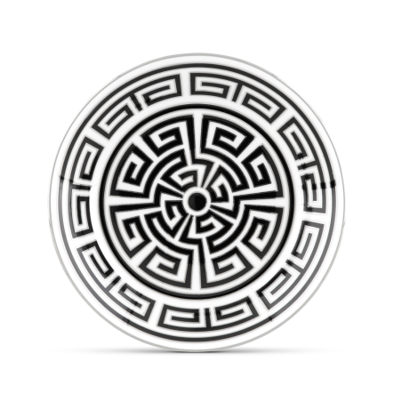 Piatto da tè in porcellana con decoro nero e platino. Collezione Labirinto di Gio Ponti.