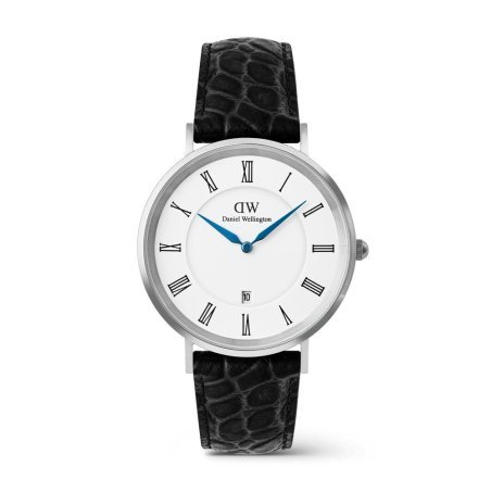 L'orologio Daniel Wellington con data in numeri romani classici è un esempio di eleganza senza tempo. Presenta un quadrante bianco con dettagli in argento e lancette blu, racchiuso in una cassa di acciaio inossidabile 316L di 40 mm. Il cinturino in vera pelle di coccodrillo nero è intercambiabile e offre una lunghezza regolabile da 165 a 215 mm. Resistente all'acqua fino a 3 ATM, questo orologio è perfetto per chi cerca stile e funzionalità. Il movimento al quarzo giapponese garantisce precisione, mentre il vetro minerale protegge il quadrante.