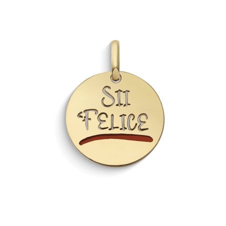 Ciondolo rotondo in oro giallo 375‰ con smalto rosso e scritta 'Sii felice'.